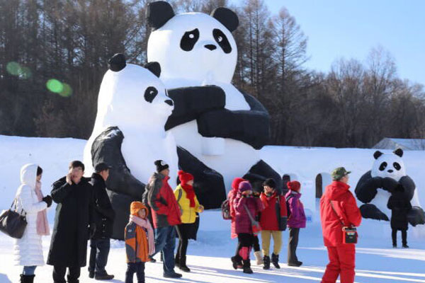 | The panda ice sculptures attract locals on Jingyue Avenue in Changchun, Northeast China's Jilin province. [Photo provided to chinadaily.com.cn] |