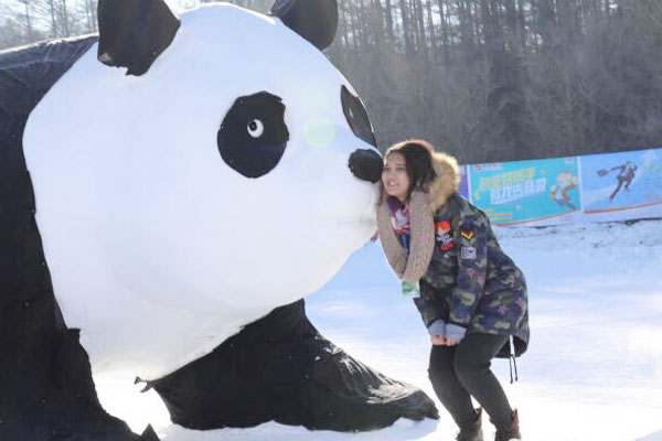 A visitor poses with a panda ice sculpture, which looks like the cute kisses the girl, on Jingyue Avenue in Changchun, Northeast China's Jilin province. [Photo provided to chinadaily.com.cn] |