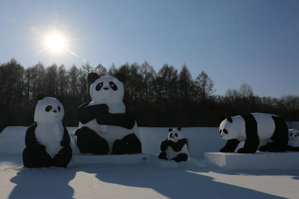 The lovely panda ice sculptures on Jingyue Avenue in Changchun, Northeast China's Jilin province. [Photo provided to chinadaily.com.cn] |