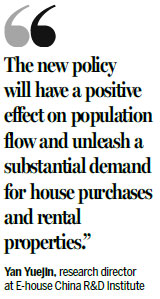 "The new policy will have a positive effect on population flow and unleash a substantial demand for house purchases and rental properties," Yan Yuejin, research director at E-house China R&D Institute, was quoted as saying by China Business Journal.