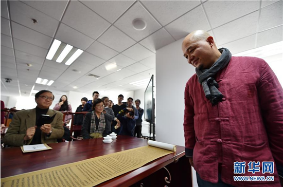 | Wei(R) introduces his engraved copy of the Diamond Sutra. [Photo/Xinhua] |