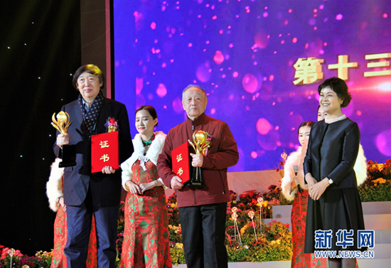 | Feng Jicai (L) and Wu Bing'an at the awards ceremony [Photo/Xinhua] |