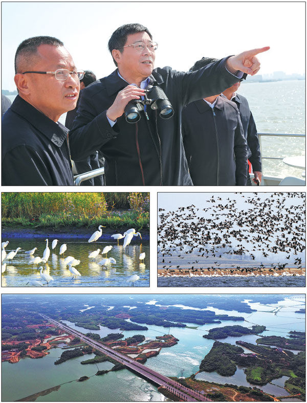 Clockwise from top: Du Jiahao (right), Party chief of Hunan, makes a study tour of the province’s waterways. Migrant birds fl ock to Dongting Lake as a result of the improving ecology. Water quality of Dongting Lake and Hunan’s major rivers has improved substantially in recent years. Rare bird species have been observed at the Western Dongting Lake Nature Reserve after Euramerican poplars were chopped for ecological restoration. [Photo provided to China Daily]