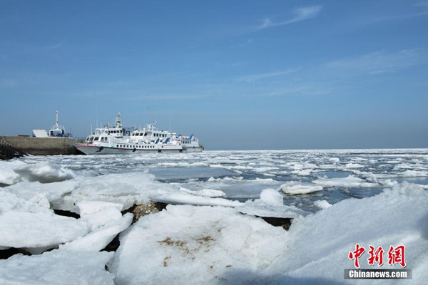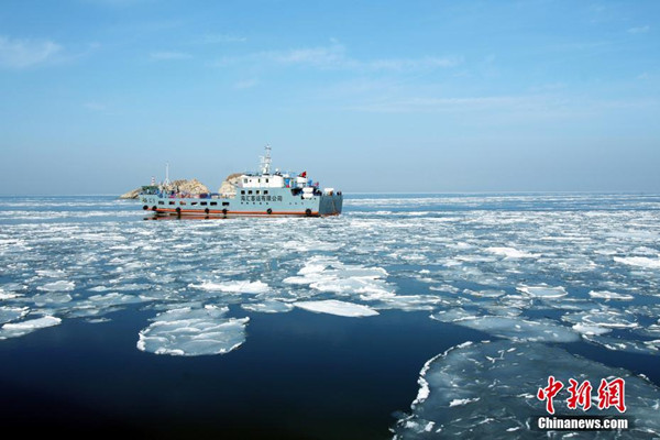 A photo taken on Jan 20, 2018, shows ice on the Yellow Sea in Dalian, Northeast China's Liaoning province. Sea ice formed here due to the continuous low temperatures. [Photo/Chinanews.com]