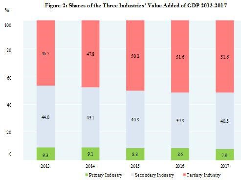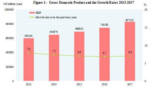 The per capita GDP in 2017 was 59,660 yuan, up by 6.3 percent compared with the previous year. The gross national income in 2017 was 82,501.6 billion yuan, up by 7.0 percent over the previous year.