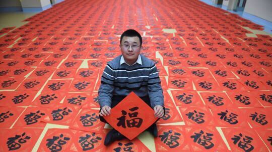 Huang Shuai poses with his fu characters. [Photo by Zhang Yao/chinadaily.com.cn]