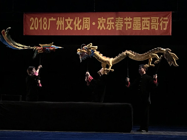 A puppet show featuring a duo of dragon and phoenix-shaped puppets is performed by Guangzhou artists in Mexico City. [Photo provided to chinadaily.com]