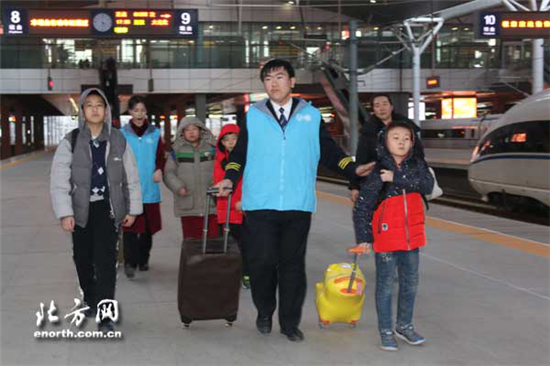 | A volunteer (C) from Tianjin Railway Technical and Vocational College helps passengers with their luggage in Tianjin Railway Station. [Photo/enorth.com.cn] |