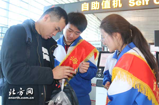 | Middle school students help a passenger check in at Tianjin Binhai International Airport. [Photo/enorth.com.cn] |