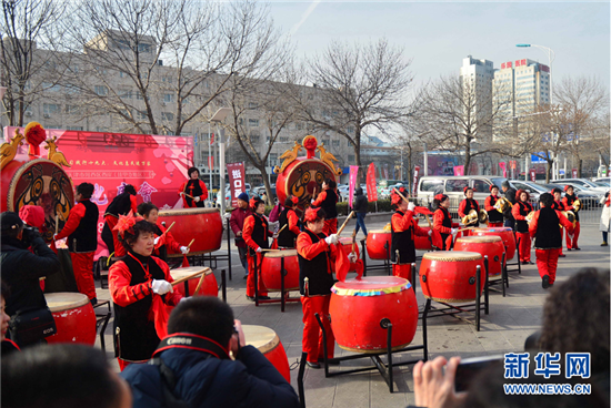 | Residents beat drums and clang cymbals at the temple fair on Feb 8. [Photo/Xinhua] |