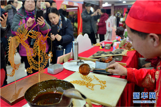 | The sugar-figure blowing attracts onlookers. [Photo/Xinhua] |