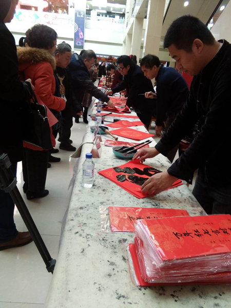 | Calligraphy enthusiasts write the Chinese character "Fu", which means good luck, at the Eurasia Shopping Mall. [Photo provided to ejilin.gov.cn] |
