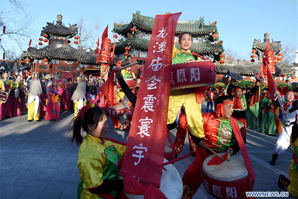 Actors perform at a temple fair in Longtanhu Park, in Beijing, capital of China, Feb 16, 2018. [Photo/Xinhua]