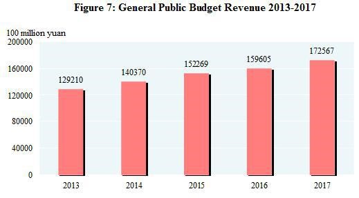 The general public budget revenue reached 17.26 trillion yuan($2.56 trillion) in 2017, up by 7.4 percent over the previous year.