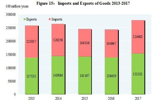The total value of imports and exports of goods in 2017 reached 27.79 trillion yuan($4.12 trillion), up by 14.2 percent from the previous year. Of this total, the value of goods exported was 15.33 trillion yuan, up by 10.8 percent; the value of goods imported was 12.46 trillion yuan, up by 18.7 percent. The balance of imports and exports (exports minus imports) was 2.87 trillion yuan, a drop of 473.4 billion yuan from the previous year.