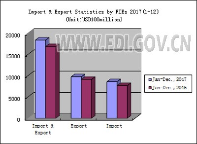 In 2017, imports and exports of foreign-invested enterprises totaled US$ 1.84 trillion, up by 9.02 percent year-on-year, 2.33 percent lower than the growth rate of the country in the same period, accounting for 44.81 percent of the national total.