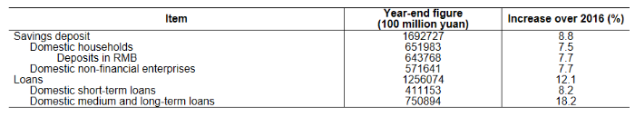 In 2017, the increase in social financing reached 19.4 trillion yuan, or 1.6 trillion yuan more than that in 2016 on a comparable basis. The existing fund of social financing totaled 174.6 trillion yuan at the end of 2017, up by 12.0 percent compared with the end of 2016. Savings deposits in Renminbi and foreign currencies in all branches of financial institutions totaled 169.3 trillion yuan at the end of 2017, an increase of 13.7 trillion yuan compared with the beginning of the year. Of this total, savings deposits in Renminbi stood at 164.1 trillion yuan, an increase of 13.5 trillion yuan. Loans in Renminbi and foreign currencies in all branches of financial institutions reached 125.6 trillion yuan, an increase of 13.6 trillion yuan. Of this total, loans in Renminbi were 120.1 trillion yuan, an increase of 13.5 trillion yuan.