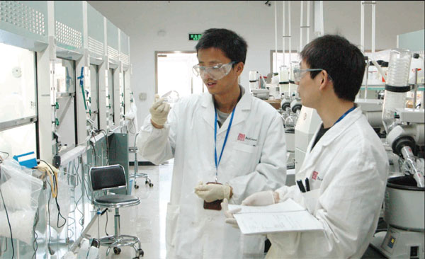 Scientists discuss use of equipment at the central chemistry lab of BeiGene in Beijing in May 2017. Photos Provided to China Daily