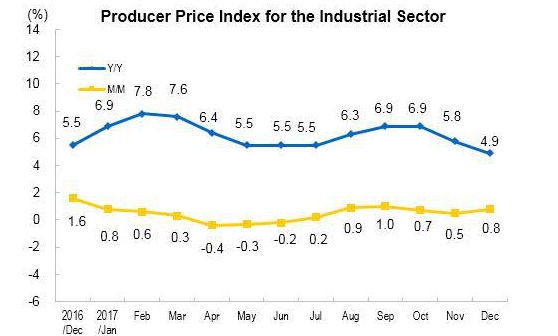 In December alone, producer price inflation rose 4.9 percent year-on-year, retreating from November's 5.8 percent, NBS data showed, as the government enhanced efforts to tackle pollution. On a monthly basis, the figure was up 0.8 percent.