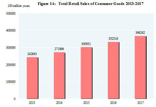 In 2017, the total sales value of wholesale and retail trades reached 63.02 trillion yuan($9.33 trillion), and the total retail sales of consumer goods reached 36.63 trillion yuan, a growth of 10.2 percent from 2016.