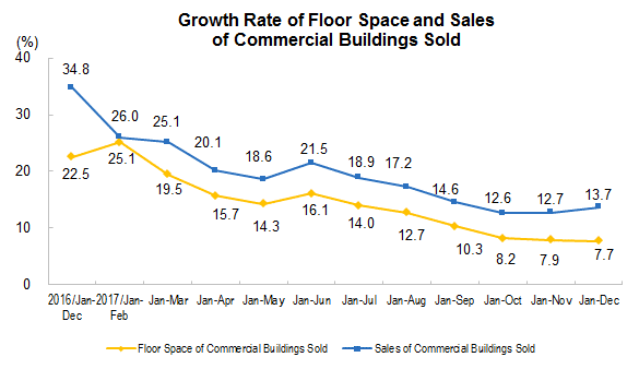 In 2017, the floor space of commercial buildings sold stood at 1.69 billion square meters, a year-on-year increase of 7.7 percent, and a decrease of 0.2 percentage points over the first eleven months in 2017. The floor space of residential buildings increased 5.3 percent, office building space increased 24.3 percent, and buildings for business use increased 18.7 percent. The sales of commercial buildings amounted to 13.37 trillion yuan, an increase of 13.7 percent, the rate of growth went up by 1 percentage point. Specifically, the sales of residential buildings went up by 11.3 percent, office buildings were up by 17.5 percent, and buildings for commercial businesses were up 25.3 percent.