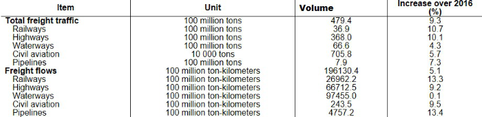 In 2017, total freight traffic reached 47.9 billion tons, up by 9.3 percent from 2016, and the freight flows were 19.61 trillion ton-kilometers, up by 5.1 percent. The volume of freight handled throughout the year by ports above a designated size totaled 12.6 billion tons, up 6.4 percent from the previous year. Of this total, freight for foreign trade was 4.0 billion tons, up 5.7 percent. Container shipping of ports above a designated size reached 236.80 million standard containers, up by 8.3 percent.