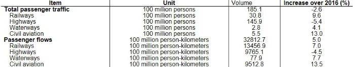 The total passenger traffic in 2017 reached 18.5 billion people, down by 2.6 percent from 2016, and the passenger flows were 3,281.3 billion person-kilometers, up by 5.0 percent.
