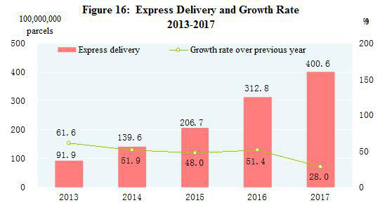 The turnover of post services totaled 976.4 billion yuan, up 32.0 percent from 2016. The number of mail deliveries, parcel deliveries and express deliveries reached 3.15 billion, 30 million and 40.06 billion respectively. The revenue from express deliveries reached 495.7 billion yuan.