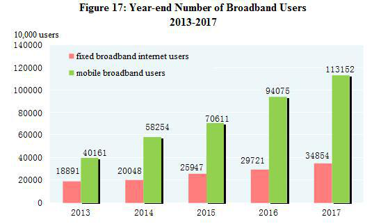 The turnover of telecommunication services totaled 2.76 trillion yuan, up 76.4 percent from 2016. The newly-increased capacity of the mobile phone switchboard was 236.46 million lines with the total capacity reaching 2,421.86 million lines. By the end of 2017, there were 1,611.25 million phone subscribers in China, of whom 1,417.49 million were mobile phone users.
