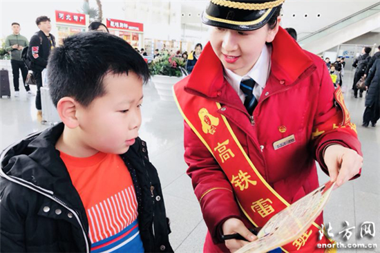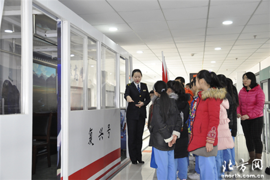 Staff members of Tianjin West Station guided primary school students around the training base, introduced the history of Chinese high-speed trains, and offered tips on taking the trains safely to strengthen their consciousness of helping others.