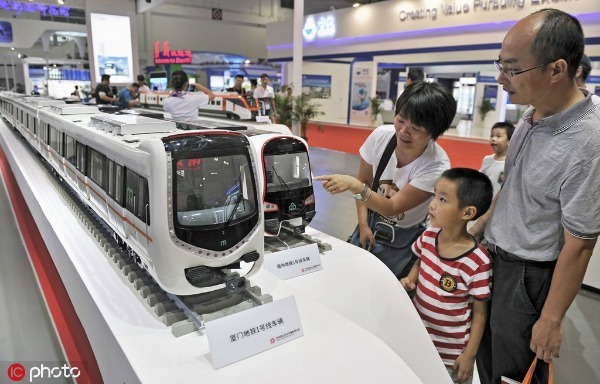 Visitors look at models of metro trains on display at the stand of CRRC during the 14th China Cross-strait Technology and Projects Fair in Fuzhou city, southeast China's Fujian province, 18 June 2016. [Photo/IC]