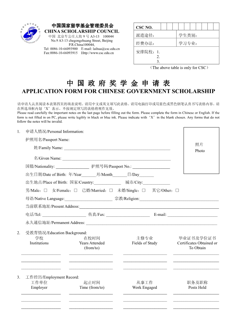 Application Form for Chinese Government Scholarship