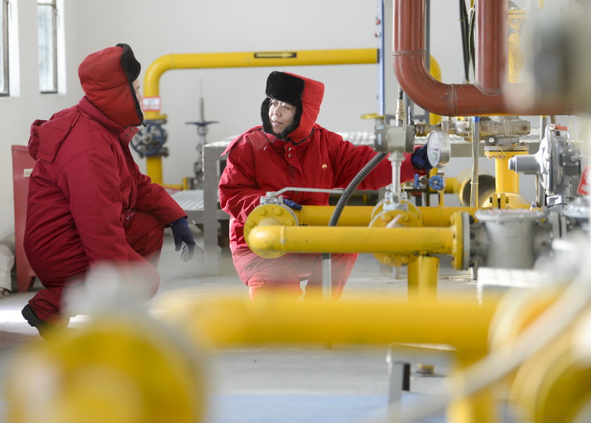 Technicians at Petro China's Xinjiang Oilfield Company make routine checks of equipment in early February in Karamay, Xinjiang Uygur autonomous region. [Photo by Zhao Ge/Xinhua]