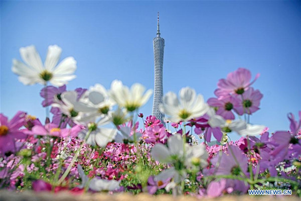 Photo taken on April 8, 2018 shows the view of Canton Tower with flowers at Haixinsha Park in Guangzhou, capital of south China's Guangdong Province. (Xinhua/Cai Yang)