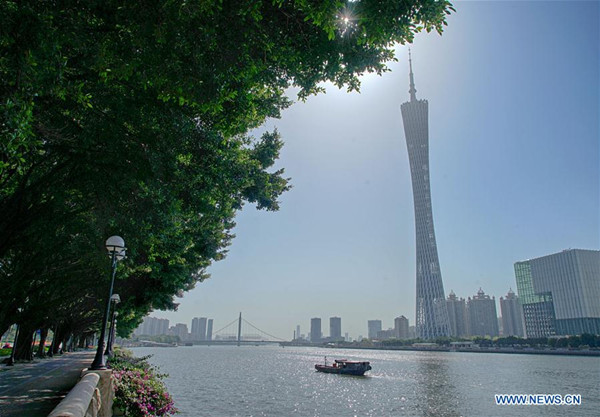 Photo taken from Ersha Island on April 8, 2018 shows the view of Canton Tower in Guangzhou City, capital of south China's Guangdong Province. (Xinhua/Cai Yang)
