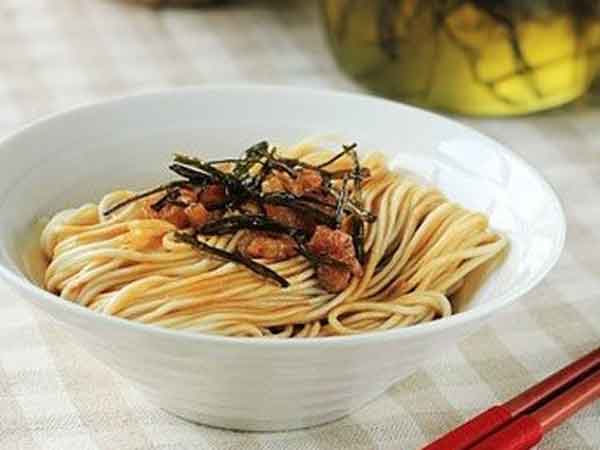 This is a type of chewy noodle soaked in hot decocted scallion oil with tasty dried shrimps.