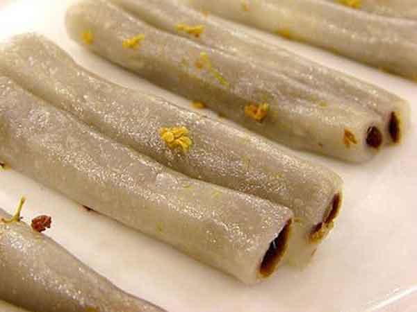 Tiaotougao is a kind of sticky rice cake bar, a sweet dessert made with sticky rice flour, together with red bean paste as the stuffing and sugar osmanthus on top. It has a firm custard-like texture which is different to many western palates.