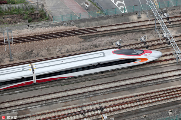 A high-speed train runs on the Guangzhou-Shenzhen-Hong Kong Express Rail Link (XRL) after departing from Shenzhen North Railway Station in Shenzhen city, South China's Guangdong province, May 11, 2018. The Guangzhou-Shenzhen-Hong Kong Express Rail Link, with a total length of 140 kilometers, started its trial run on Monday. It took the train an hour and 18 minutes to reach the West Kowloon terminus from Guangzhou South Station, with stops in Futian, Shenzhen North and Humen. [Photo/IC]