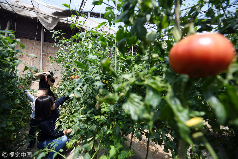 Zhou Na purchases vegetables at a greenhouse field, more than 60 km away from Taiyuan downtown. [Photo/VCG]