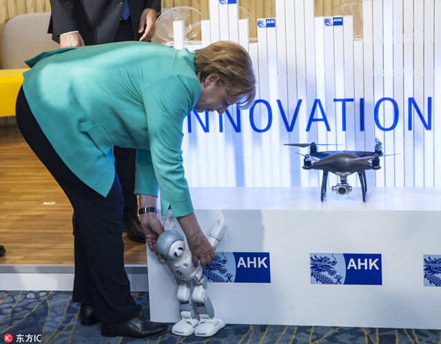 German Chancellor Angela Merkel meets a robot during the launch of an innovation hub in Shenzhen, Guangdong Province, on May 25. [Photo/DFIC]
