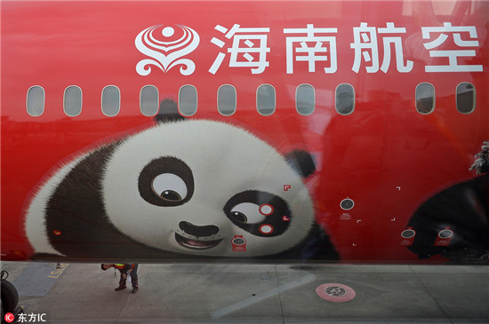 | A ground crew member checks a jet plane operated by Hainan Airlines with a picture of Kung Fu Panda at the Chengdu Shuangliu International Airport in Chengdu city, Southwest China's Sichuan province, March 15, 2017. [Photo/IC] |
