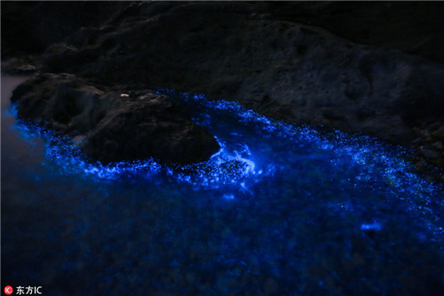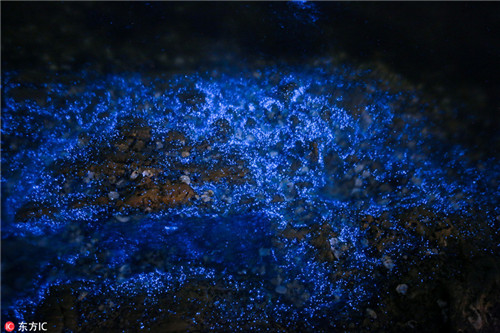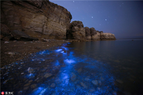 An algal bloom of dinoflagellate illuminates sea water, turning it bright blue at the coast in Dalian city, Northeast China's Liaoning province, June 4, 2018. [Photo/IC]