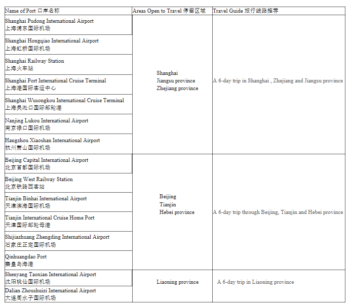 1. Ports for 144-hour visa exemption and areas open to trave