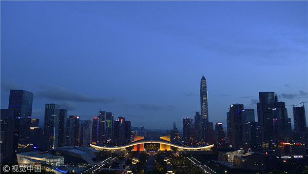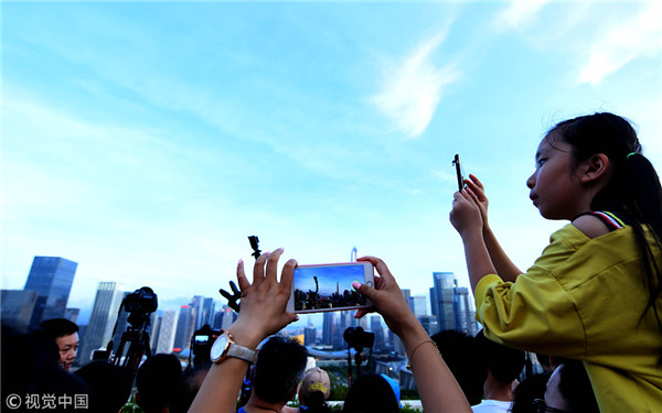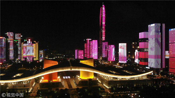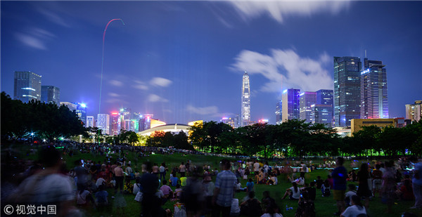 Shenzhen locals flock to view the light show test. [Photo/VCG]