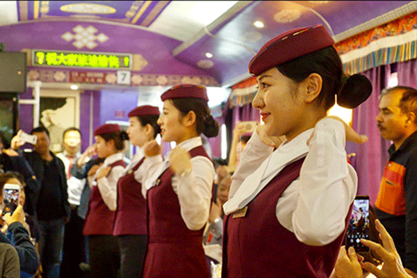 Cabin crew on one of the tourism trains along Tangzhu Road. [Photo provided to China Daily]