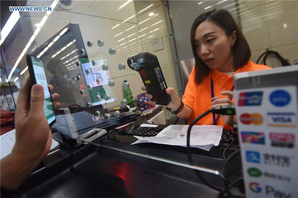A passenger pays a ticket at the Hong Kong West Kowloon Station, in Hong Kong, south China, on Sept. 10, 2018. The Guangzhou-Shenzhen-Hong Kong high-speed railway will officially start operation on Sept. 23. The sale of the tickets began on Monday. (Xinhua/Wang Shen)