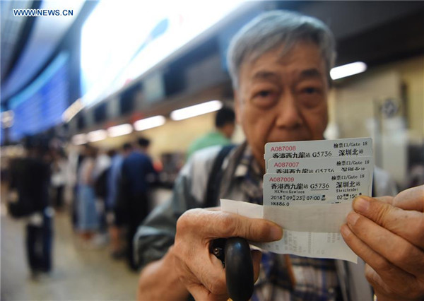 A passenger shows high-speed railway tickets from Hong Kong West Kowloon Station to Shenzhen North Station, in Hong Kong, south China, Sept. 10, 2018. The Guangzhou-Shenzhen-Hong Kong high-speed railway will officially start operation on Sept. 23. The sale of the tickets began on Monday. (Xinhua/Wang Shen)