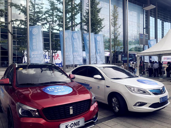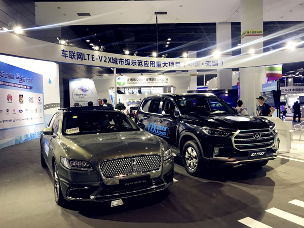 V2X-capable vehicles are on display at a pavilion of the Wuxi Taihu International Exposition Center on Sept 14. [Photo by Xiang Wenjian/chinadaily.com.cn]