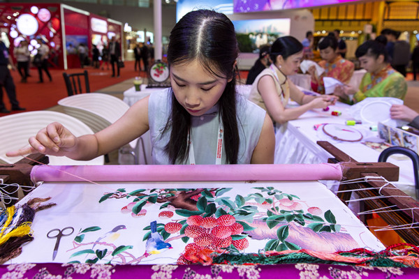 An inheritor shows her Guangxiu embroidery techniques at the promotion event held after the opening ceremony of the 24th World Route Development Forum on Sept 16. [Photo provided to chinadaily.com.cn]