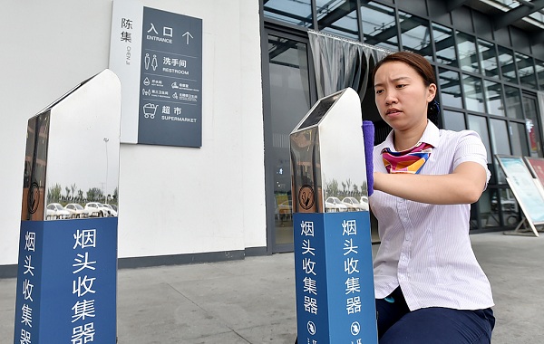 A staff member cleans dustbins so that smokers can throw their cigarette butts and maintain a clean environment at Chenji service station. [Photo/VCG]